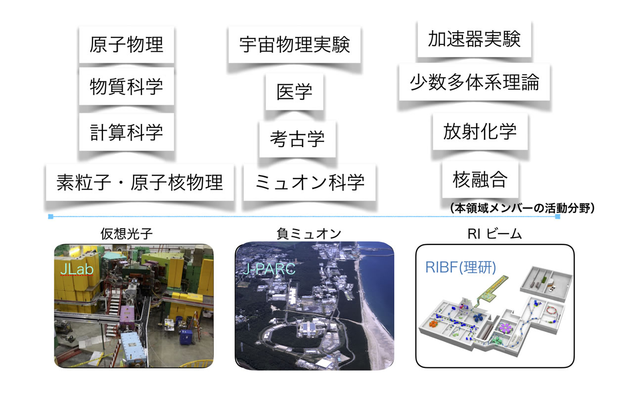 加速器が, 現代科学の担い手であり, 今後もあり続けることに違いありません。ヒッグス粒子の発見をもたらしたエネルギーフロンティアはもとより, 我が国の大強度陽子加速器施設 (J-PARC) などにみられる輝度フロンティアにおいても, 著しい技術進歩がみられます。本領域は, 宇宙 X 線・ガンマ線観測のための最先端検出器の研究者が, 異なる分野の研究者に「出会った」ところに端を発します。そして, 宇宙観測検出器の技術を負ミュオンビーム, 高エネルギー光子ビーム, 偏極を付加した放射性同位元素 (RI) ビームという, 日本が国際的に極めて優位な位置にある 3 つの「エキゾチック」な量子ビームの研究を結びつけ, 新たな視点や手法による研究を共同で行うことを目的として本領域が提案されました。本領域では, それぞれの基礎科学分野の研究を深化させるばかりではなく, 元素分析から医学にいたる異分野融合による応用研究において新しい展開を行うことを目的とした研究を行います。