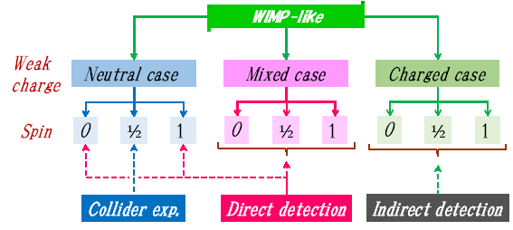 This classification is summarized in Fig.2. First, the thermal dark matter has a weak charge in the unit of 1/2, namely, 0, 1/2, 1, etc. There is, however, an exception: dark matter may be described by the mixing (linear combination) of states which have different weak charges. Within the familiar electromagnetic dynamics, it corresponds to the case that we consider the particle whose electric charge is given by the mixing of, e.g., 0 and 1. Of course, such mixing occurs only for the weak force because of the electroweak symmetry breaking, and never occurs for other forces. As a result, dark matter can be classified into three categories: it has no weak charge (neutral under the weak force), has a non-zero weak charge, or has mixed weak charges. Next, if we restrict ourselves by considering a renormalizable theory to guarantee enough magnitude of interactions between dark matter and standard model particles, the spin of dark matter is restricted to be either 0, 1/2, or 1. Thanks to the nature of the relativistic quantum field theory, once the weak charge and the spin of dark matter are fixed, all interactions between dark matter and standard model particles are uniquely determined from the viewpoint of minimality and renormalizability, which allows us to discuss the physics of the WIMP-like thermal dark matter quantitatively.
